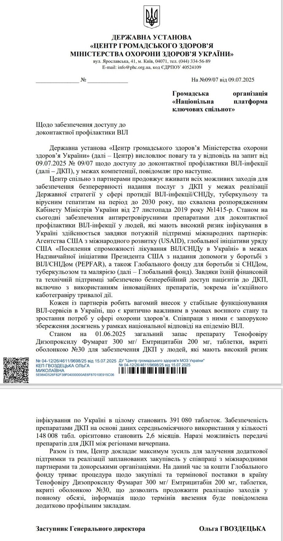 У відповідь на повторний запит, ЦГЗ повідомив: «Забезпеченість … становить 2,6 місяців. Наразі можливість передачі препаратів для ДКП між регіонами вичерпана». Саме це стало для активіста останньою краплею.