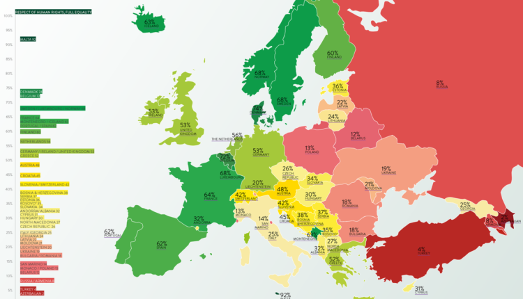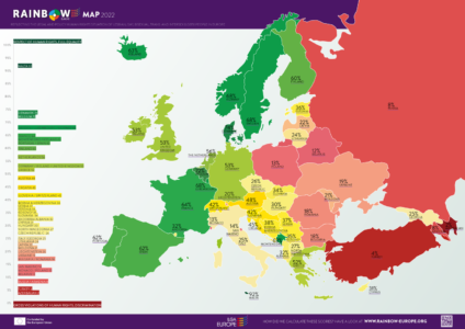 Україна посідає 39 місце посеред 49 країн Європи в цьогорічному Веселковому індексу ILGA-Europe, який демонструє рівень політико-правового захисту прав ЛГБТК+ людей по всіх країнах Європи на початок поточного року.