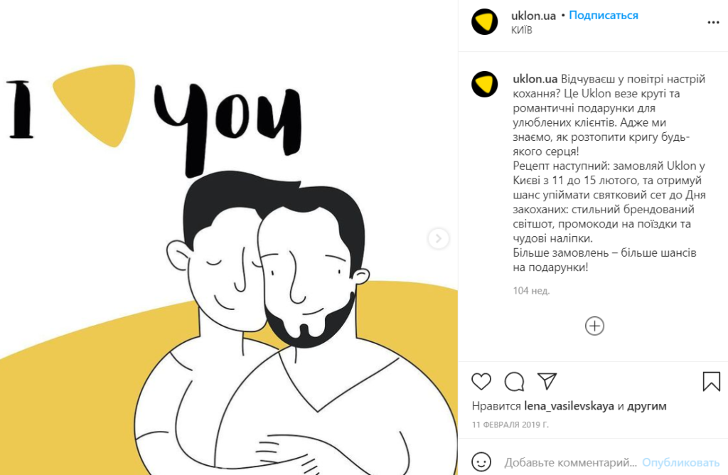 В позапрошлом году на теме ЛГБТ пыталась сыграть компания Uklon, которая также ко дню Валентина запустила промоакцию с изображением однополых пар. Правда, после того, как рекламу “захейтили” в комментариях, их пришлось скрыть.