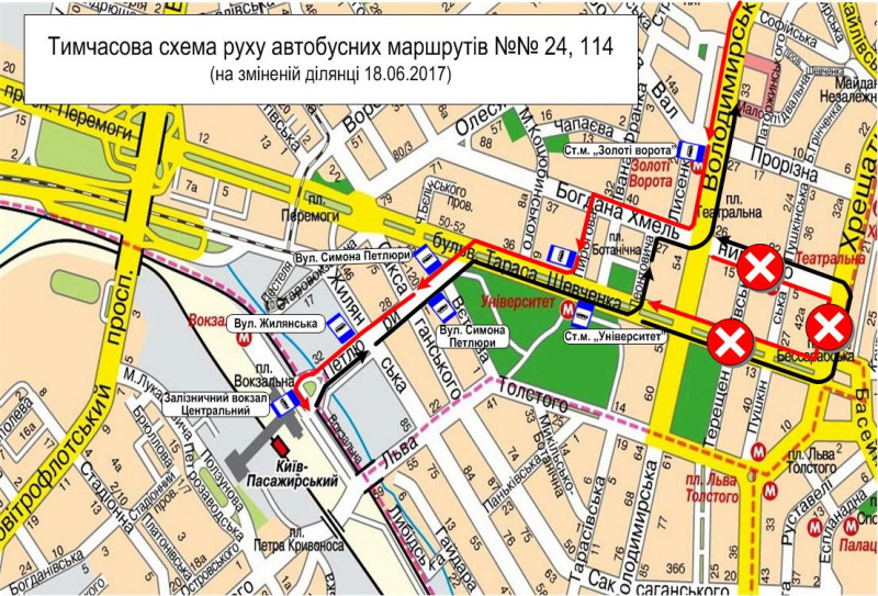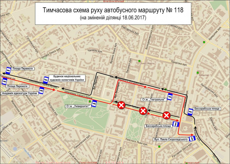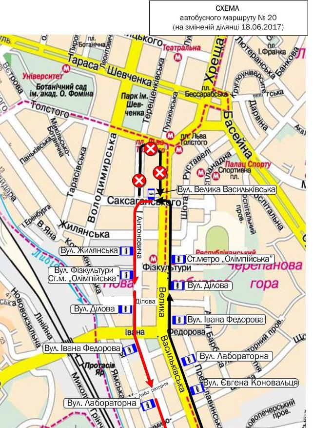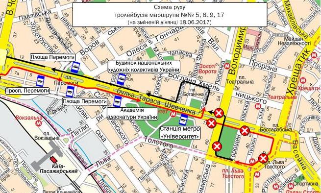 Согласно информации пресс-службы, временно запретят движение на ул. Владимирской (на участке от ул. Богдана Хмельницкого до ул. Льва Толстого), ул. Льва Толстого (на участке от ул. Тарасовской до площади Льва Толстого), ул. Антоновича (на участке от ул. Саксаганского до ул. Льва Толстого), ул. Большой Васильковской (на участке от ул. Саксаганского до ул. Павла Скоропадского), ул. Пушкинской (на участке от б-р Тараса Шевченко до ул. Льва Толстого), на б-ре Тараса Шевченко (на отрезке от Бессарабской площади до ул. Леонтовича в обоих направлениях).
