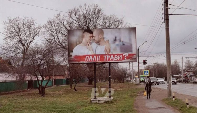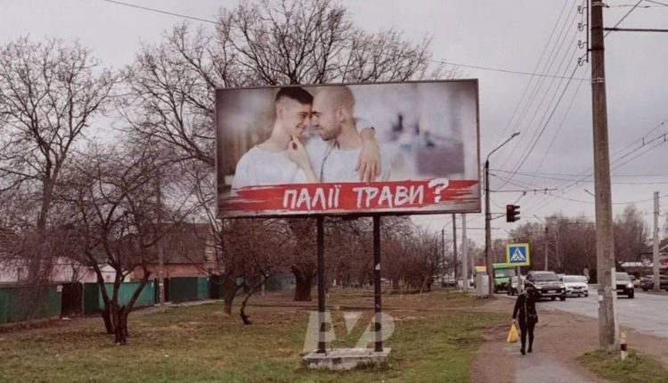 В Полтаве появился билборд с гомофобной рекламой против людей, поджигающих траву. На полотне изображены двое стоящих рядом мужчин. Один приобнял другого через шею, а тот, в свою очередь, прикоснулся к подбородку первого. Под фотографией значится надпись “Поджигатели травы?”.