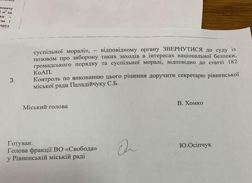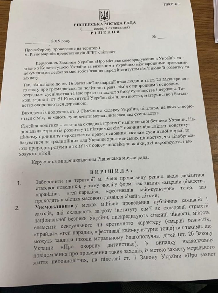 В проекте решения также говорится: «Запретить на территории г. Ровно пропаганду различных видов девиантного полового поведения, в том числе в форме так называемых „маршей равенства“, „прайдов“, „фестивалей квир-культуры“ и т. п., проходящих в местах массового досуга семей с детьми».