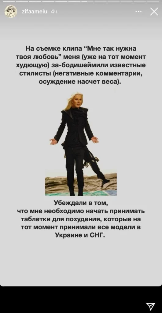 “На съемке клипа “Мне так нужна твоя любовь” меня (уже на тот момент худющую) забодишеймили известные стилисты”, – рассказала артистка.