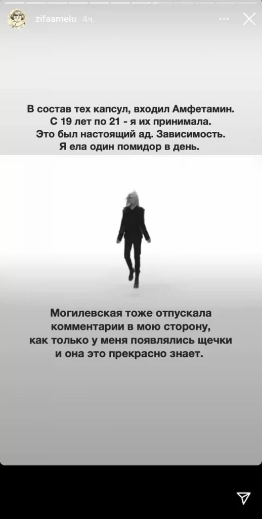 “В состав тех капсул входил амфетамин. С 19 лет по 21 – я их принимала. Это был настоящий ад. Зависимость. Я ела один помидор в день”, – вспоминает артистка.