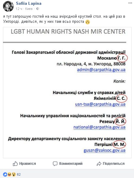я здесь приглашаю гостей на наш ачиредной круглый стол. на этот раз в Ужгороде. смотрите, как у них там всьо проста, – написала в посте активистка.