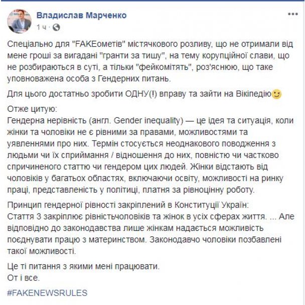 Пост Ковылиной вызвал шквал критики и возмущения от интернет-пользователей. В ответ сам Марченко опубликовал “разъясняющий пост” на своей Facebook-странице. По словам депутата, принцип гендерного равенства четко закреплен в Конституции Украины:
