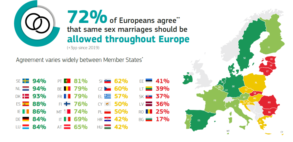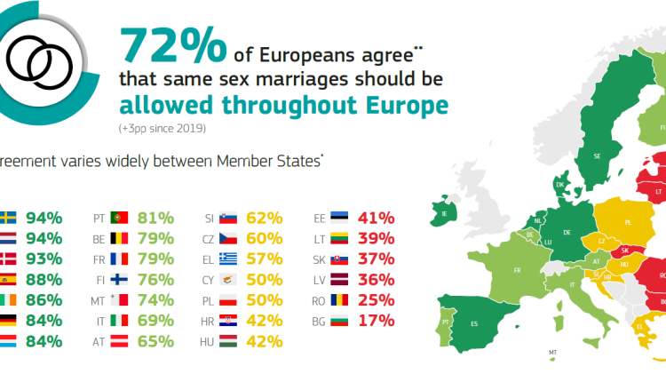 Однак, результати опитування дуже суттєво різняться для різних країн Євросоюзу: наприклад, підтримка одностатевих шлюбів варіює від 94% у Нідерландах і Швеції до 17% у Болгарії. Загальні тенденції, втім, для ЛГБТК спільноти радше позитивні: підтримка прав ЛГБТК людей поступово зростає навіть у країнах, які очолюються або донедавна очолювалися відверто гомо/трансфобними урядами, такими як Угорщина і Польща — пропаганда ідеології русского міра, під якими назвами її не маскуй, не має успіху у сучасній Європі.