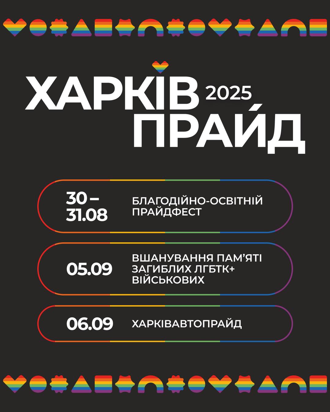 ХарківПрайд відкриє благодійно-освітній фестиваль, де звучатимуть лекції, дискусії, мистецькі події та історії сили. Це простір для обміну досвідом, підтримки, навчання та збору коштів на допомогу українським захисникам.
