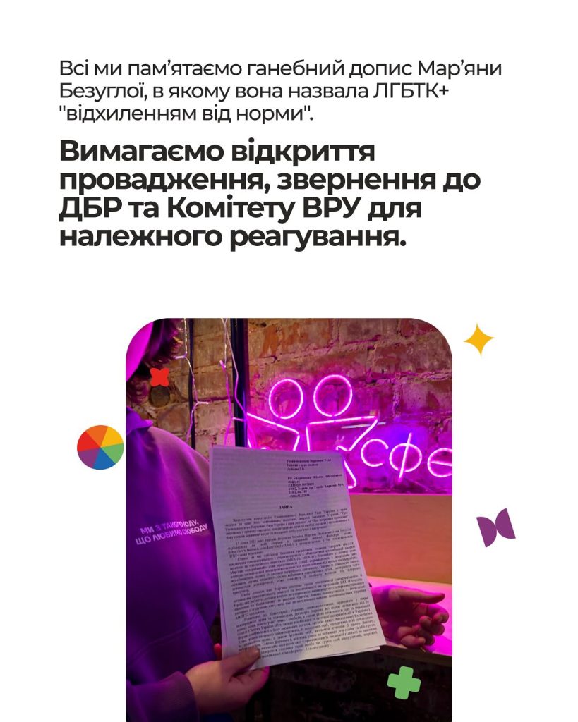 Нагадаємо, що народна депутатка Мар’яна Безугла у своєму дописі в соцмережах прирівняла ЛГБТК+ до хвороб, заперечила важливість рівності та інклюзії, поширюючи мову ворожнечі.