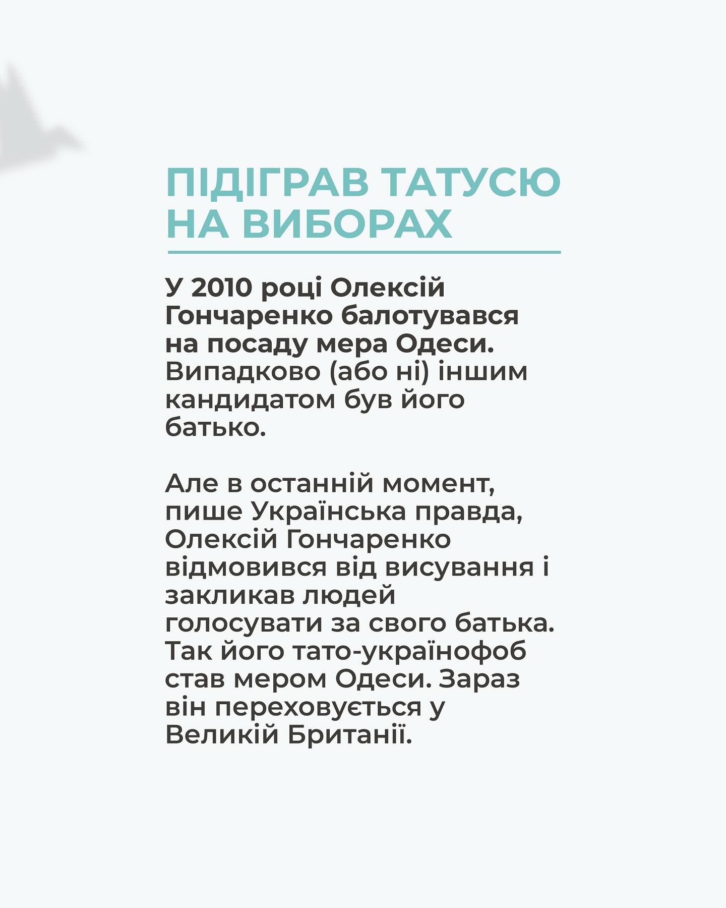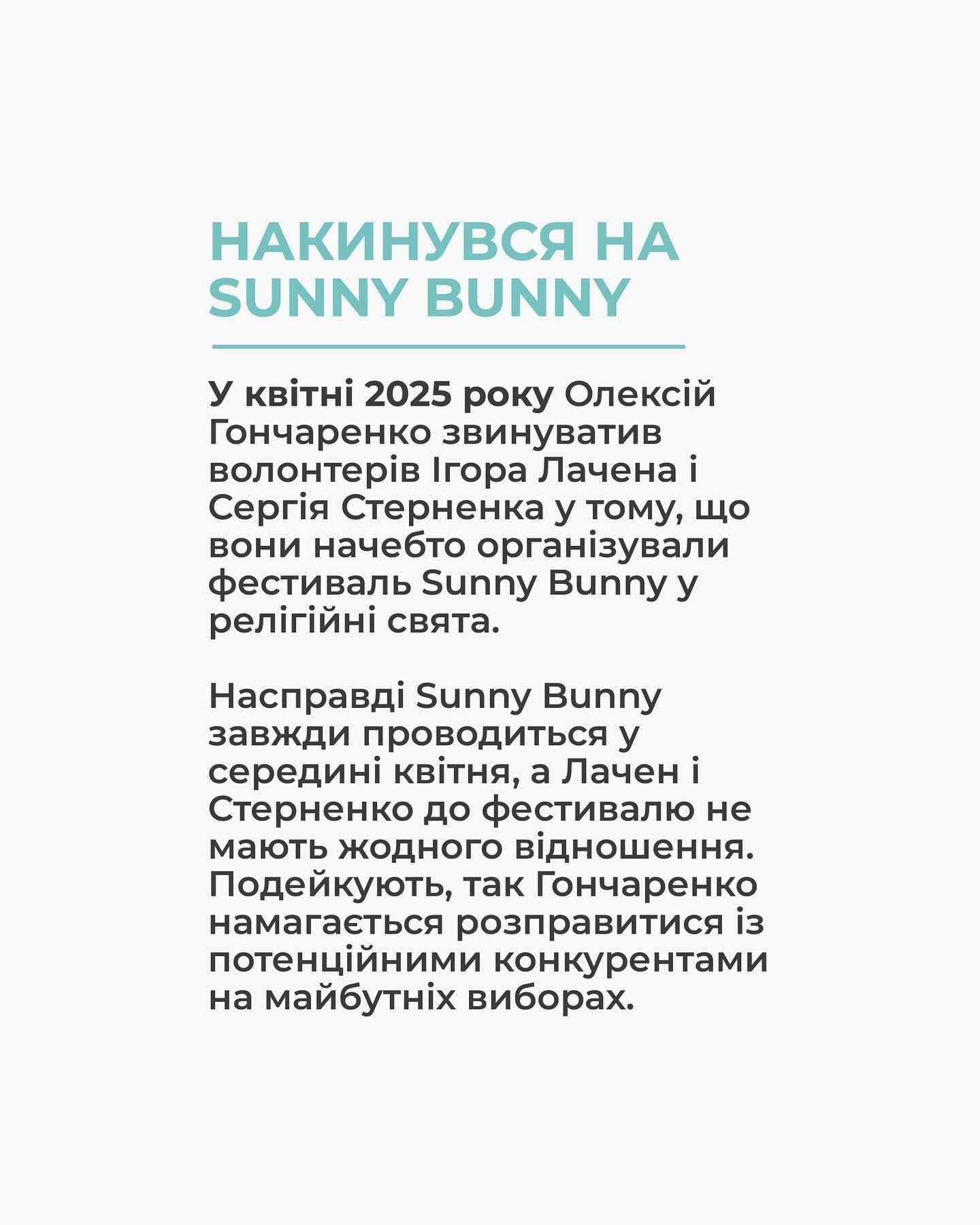 А ще Гончаренко дуже плекає свій політичний рейтинг. І придумує різноманітні приводи, щоб про нього говорили. От нещодавно він попіарився на кінофестивалі Sunny Bunny. Депутат вирішив вбити двох зайців: сподобатися гомофобам і, схоже, розправитися з можливими політичними суперниками.