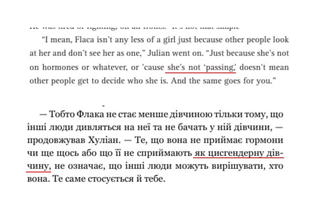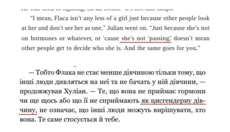 Наприклад, ділиться команда ARTBOOKS, англійське слово “passing” означає ситуацію, коли трансгендерну людину з першого погляду сприймають відповідно до її гендерної ідентичності, а не приписаної при народженні статі. В українській мові таке поняття не має короткого або загальновживаного аналога, тож доводиться шукати описові конструкції, які зберігають зміст і не звучать штучно чи зі стигмою. Так, в оригіналі “Хлопців кладовища” було “she’s not ‘passing’”, яке переклали як “її не сприймають як цисгендерну дівчину”.