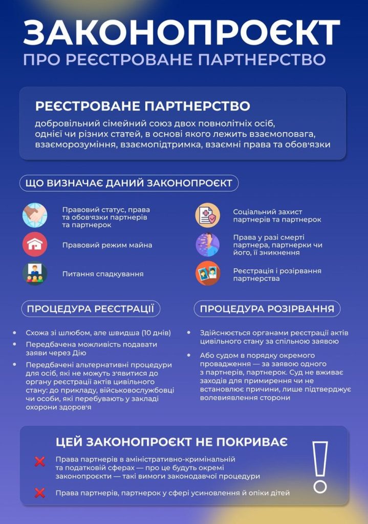 На початку березня цього року за ініціативи народних депутатів та депутаток політичних партій “Слуга Народу” та “Голос” у Верховній Раді було зареєстровано законопроєкт №9103 “Про інститут реєстрованих партнерств”. Пізніше, 28 березня, на сайті представництва Президента України було зареєстровано петицію на підтримку цього законопроєкту, яка за кілька днів набрала 14 637 голосів з необхідних 25 тисяч.
