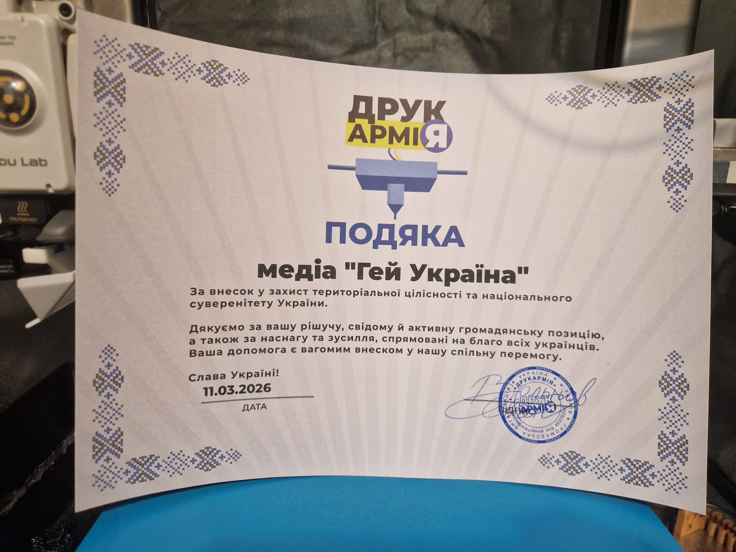 Засновники проєкту «Гей Україна» продовжують активно підтримувати українських захисників та захисниць. Нещодавно ми подолали рубіж у понад 345 кілограмів надрукованих деталей для фронту, а цими днями ми отримали офіційну подяку від волонтерської спільноти «ДрукАрмія».