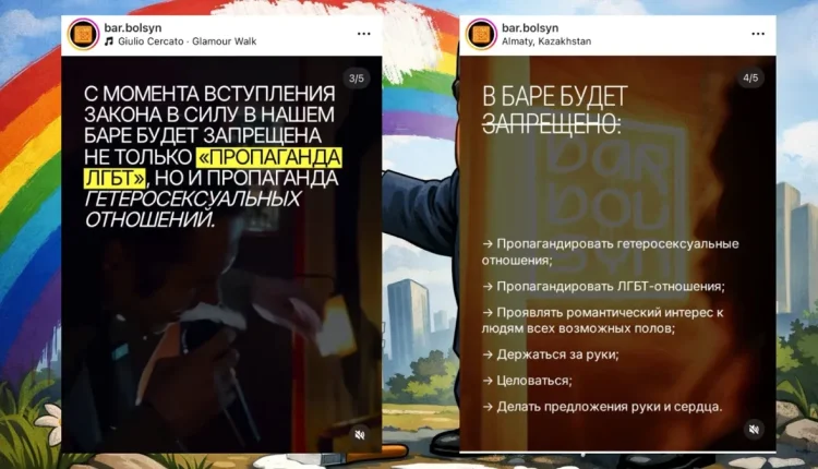 Алматинський бар BarBolsyn заборонить у своєму закладі не тільки «пропаганду ЛГБТ», а й “пропаганду гетеросексуальних стосунків” — після того, як поправки, ухвалені сенатом 18 грудня, набудуть чинності. Таке оголошення адміністрація опублікувала в Instagram.