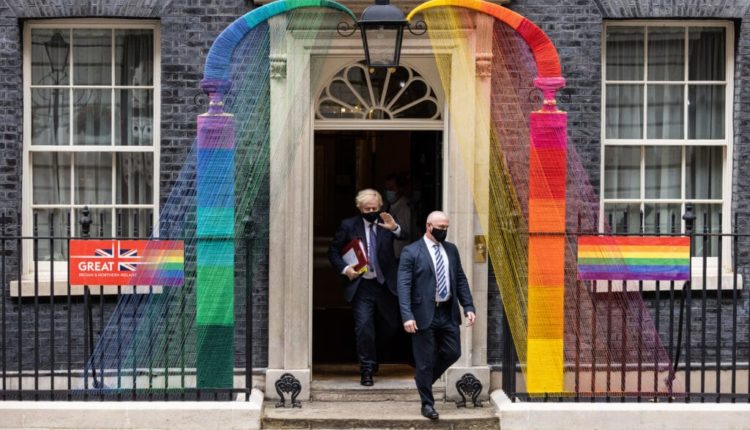 Прем’єр-міністр Великобританії Борис Джонсон проходить під інсталяцією Місяця гордості біля 10 Downing Street. (Leon Neal/Getty Images)