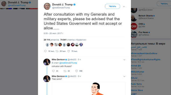 В своем микроблоге 71-летний Трамп сообщил: “После консультаций с моими генералами и военными экспертами я пришел к выводу, что правительство Соединенных Штатов не примет или не разрешит транссексуалам служить в любом качестве в вооруженных силах США”.