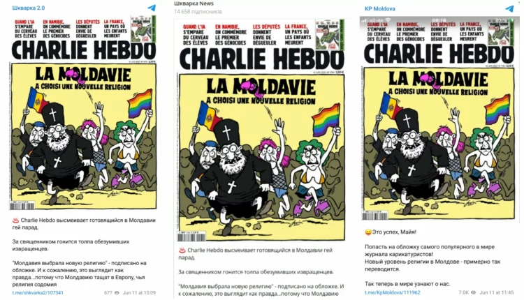 11 червня пропагандистські Telegram-канали «» та «» (), які систематично поширюють фейкову інформацію в інтересах Кремля, опублікували дописи про те, що сатиричний журнал Charlie Hebdo нібито висміяв «гей-парад у Молдові, випустивши обкладинку, на якій за священиком женеться натовп збоченців, які збожеволіли».