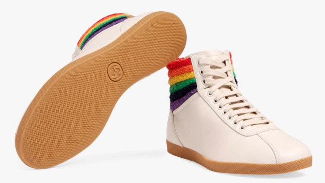 Новые кроссовки от Gucci на высокой радужной платформе в этом году позволят вам в буквальном смысле ощутить себя над всей прайд-колонной. Золотая натуральная кожа, красная и синие полосы на радужной танкетке. Последний писк прайд-моды обойдется в 995 долларов.