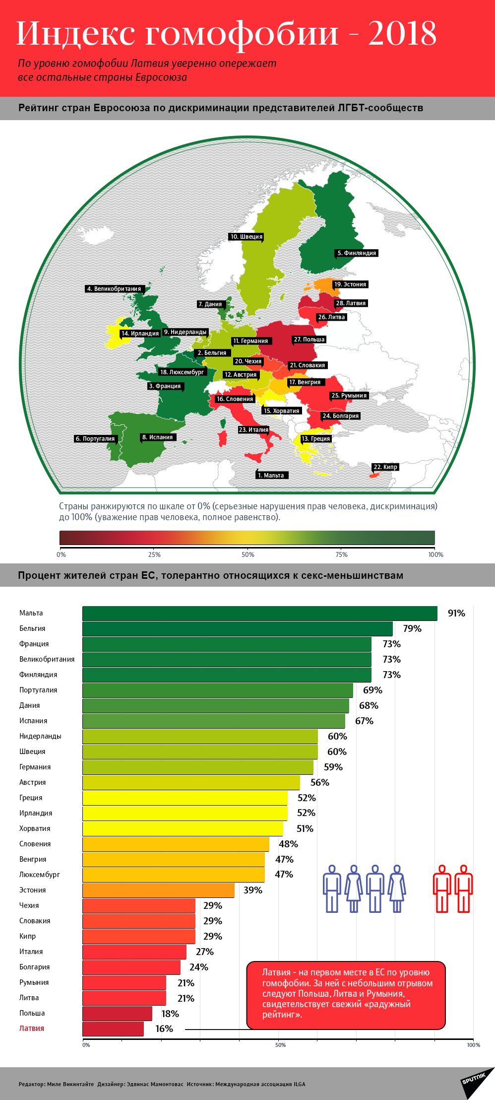 Латвия занимает последнее место в ЕС по доле жителей, которые толерантно относятся к представителям секс-меньшинств — таких в стране всего 16%. На втором месте Польша с 18%, третье делят Литва и Румыния — у них по 21%.