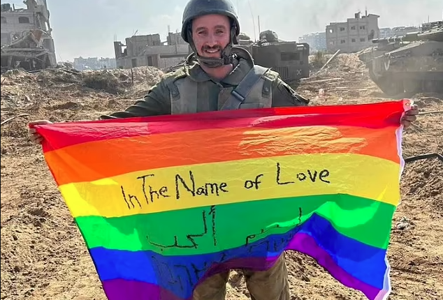 Ізраїльський солдат-гей розгорнув ЛГБТ-прапор у Газі, з написом: “В ім’я любові”.