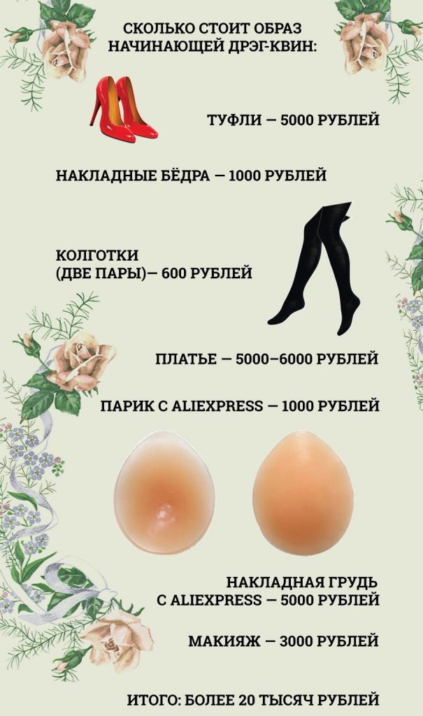 У Лорины на косметику уходит от 10 до 25 тысяч рублей в месяц. Другая дива, выступающая в гей-клубах Челябинска, каждый месяц покупает тональный крем за 2000 рублей и тушь за 500.
