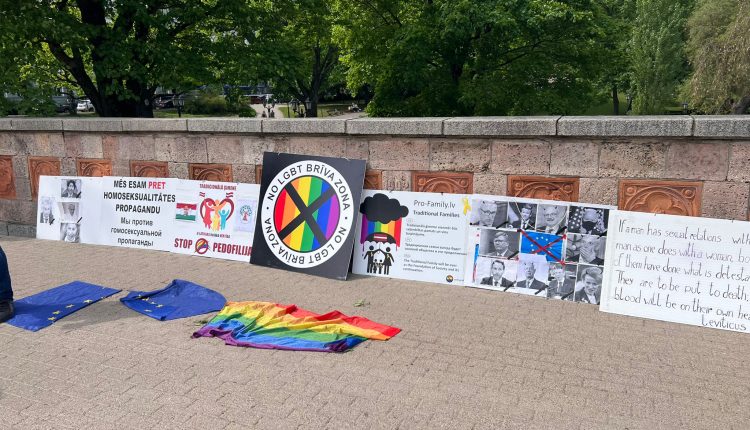 Вчора в Ризі (Латвія) пройшла невелика камерна акція проти “ЛГБТ-пропаганди”. Вкотре було розтоптано прапор ЄС і райдужний прапор.