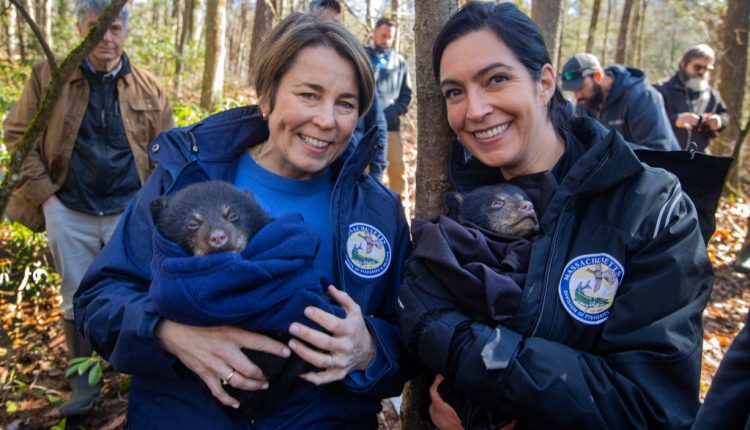 Губернаторка штату Массачусетс Мора Хілі (ліворуч) та її партнерка Джоанна Лідгейт (праворуч) тримають ведмежат і зігрівають їх, поки біологи записують дані про ведмедицю, яку заспокоїли і тимчасово вивели з барлогу. (Getty Images)