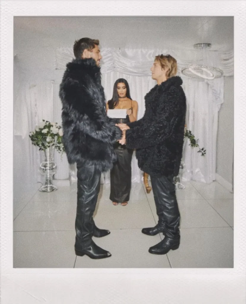 На фотографіях зображені Гейдж і Епплтон у чорних шкіряних штанях і чорних пухнастих куртках з Кардашьян на тлі знакових білих кованих залізних воріт маленької білої каплиці в Лас-Вегасі.