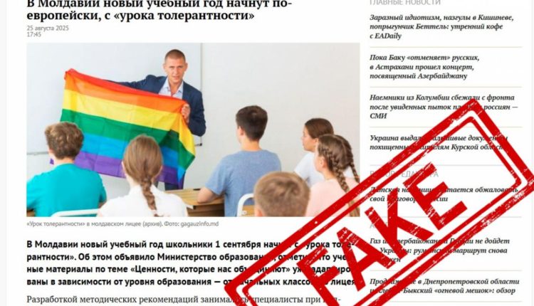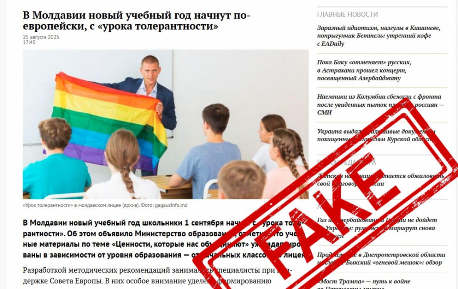 У мережі поширюють інформацію про те, що новий навчальний рік у Молдові розпочнеться з «уроку толерантності». Новину ілюструють райдужними прапорами, натякаючи на ЛГБТ-тематику. У самому тексті сказано, що пропаганду таких «європейських цінностей» активно просувають у школах. Однак це фейк, і такий урок не планується. Насправді з дітьми будуть говорити про різні теми — почуття безпеки та приналежності, цінності людської гідності, інклюзії, поваги та відповідальності.