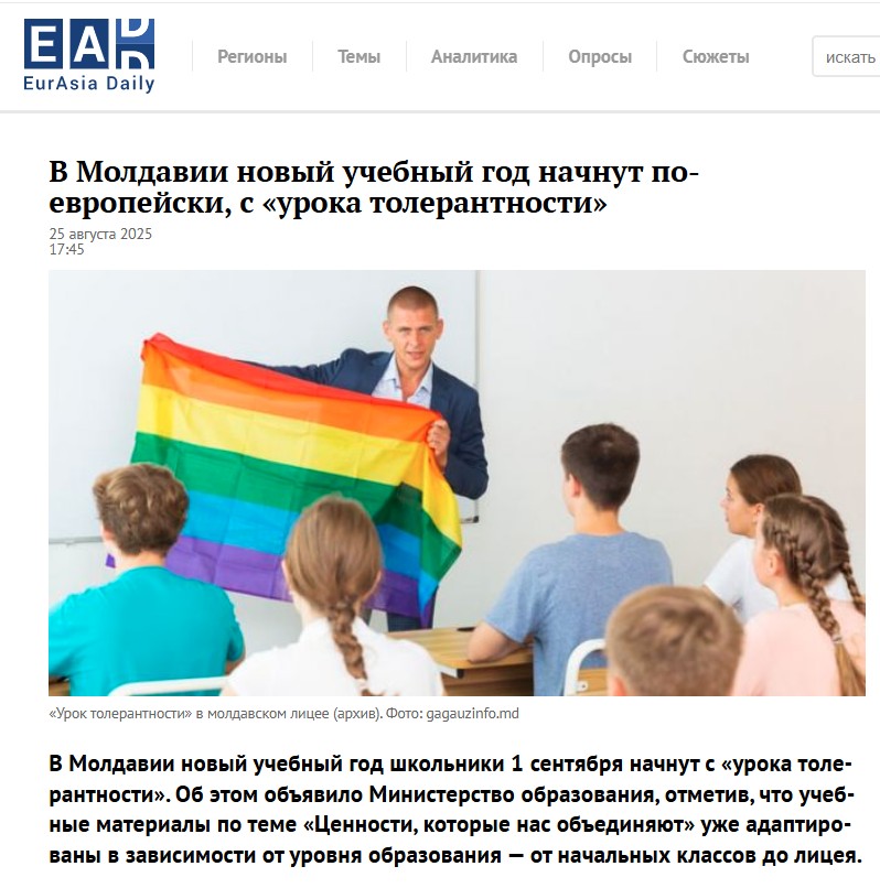 На російському сайті eadaily.com, який заблокували в Молдові у 2023 році, 25 серпня з’явилася інформація, що нібито в молдовських школах 1 вересня розпочнеться з «уроку толерантності». На обкладинці — райдужний прапор, а в тексті стверджується, що «тепер пропаганду такого роду „європейських цінностей“ підтримують на державному рівні, активно просуваючи, зокрема, у школах».