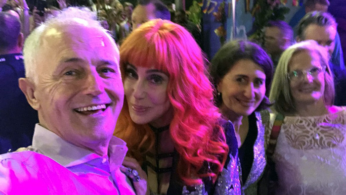 Днем ранее Шер вышла на гей-парад, собравший 300 000 участников. Звезда была в рыжем парике и расшитой блестками куртке. Она с радостью общалась с фанатами, среди которых оказались (на фото ниже) премьер-министр Австралии Малкольм Турбулл (Malcolm Turbull) и премьер-министр Новой Зеландии Гладис Бериджиклиан (Gladys Berejiklian).