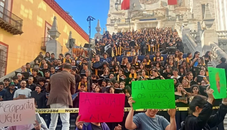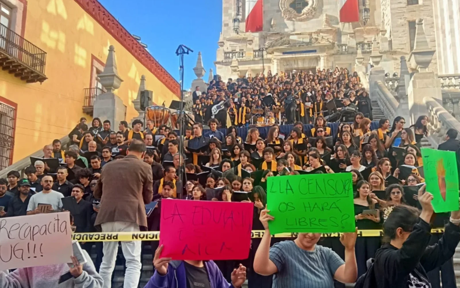 Понад 20 студентів Університета Гуанахуато, Мексика, протестували на сходах Центральної будівлі після дострокового закриття виставки «Іконоборство».