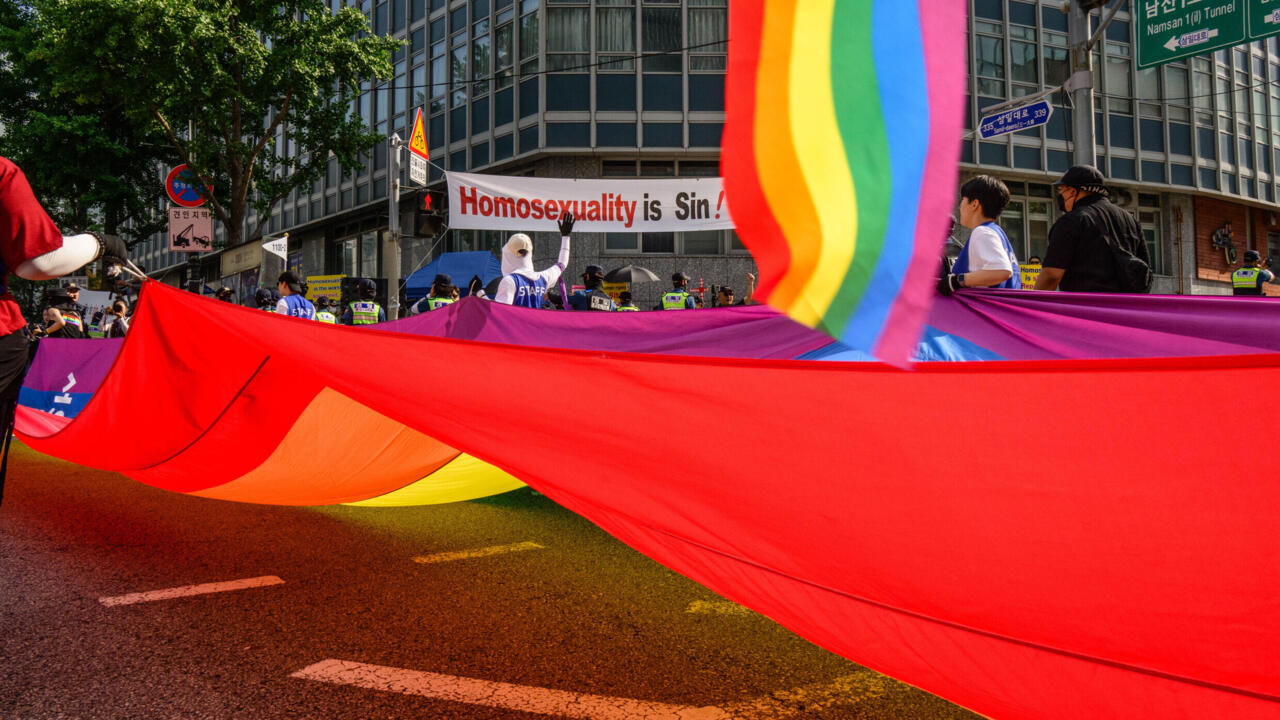 Через вулицю євангельські християни вигукували гасла на кшталт “Гомосексуальність — це гріх!”, виконуючи традиційний корейський танець з віялами.