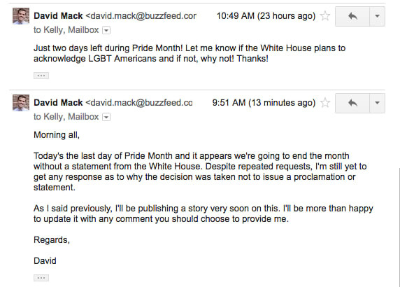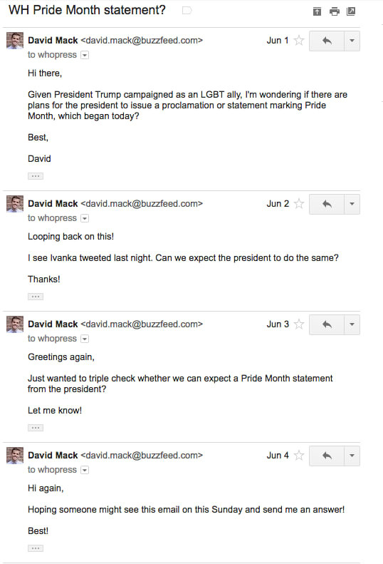 Каждый день в течение июня редактор BuzzFeed Дэвид Мэк в ожидании какого-либо заявления Трампа посылал письма на электронный ящик пресс-службы Белого дома. Две недели его игнорировали, после чего несколько раз переадресовали его письма, но в итоге 14 июня лишь пообещали, что уведомят, когда «появится что-то официальное».
