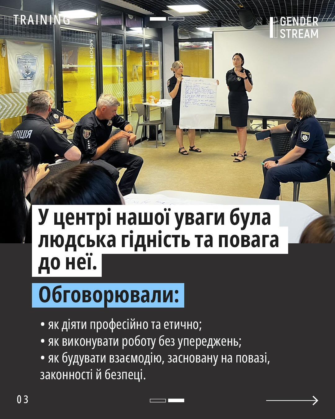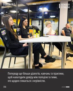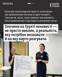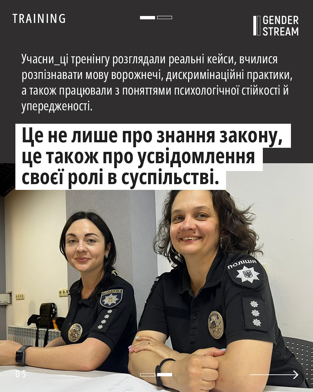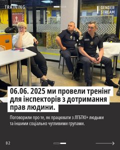 6 червня 2025 року громадська організація Gender Stream спеціалізований тренінг для інспекторів з дотримання прав людини в органах Національної поліції України. Темою заходу стала робота з ЛГБТКІ+ спільнотою та іншими соціально чутливими групами — з акцентом на гідність, безпеку та взаємну довіру.