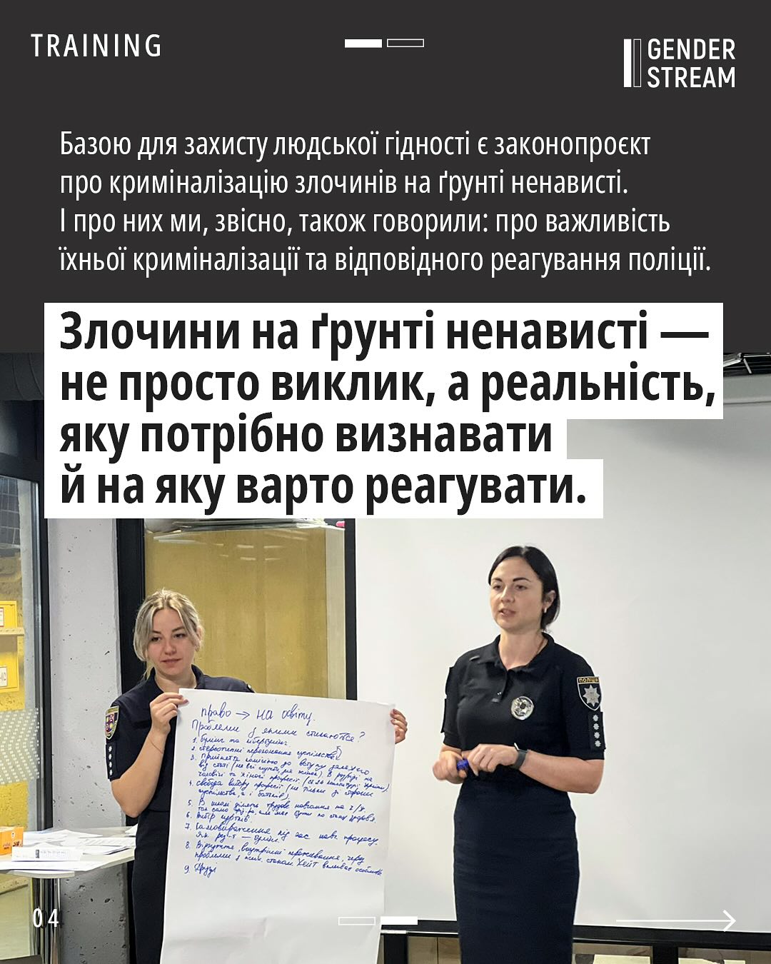 Тренінг був спрямований на підвищення обізнаності поліцейських щодо проявів дискримінації, мови ворожнечі та важливості поваги до прав кожної людини. Учасниці й учасники навчалися розпізнавати упередження — як у суспільстві, так і в собі, працювали з реальними кейсами та обговорювали механізми реагування на злочини, вчинені з мотивів ненависті.