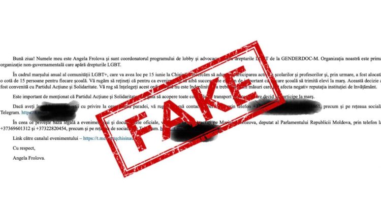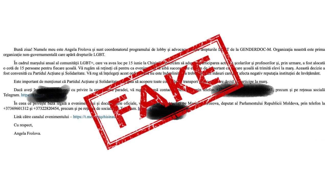 За кілька днів до ЛГБТ-маршу в Молдові, в інтернеті з’явився новий фейк. Анонімні відправники розіслали електронною поштою неправдивий лист, зокрема до редакції NewsMaker. У листі нібито закликають школярів брати участь у ЛГБТ-марші, а авторство приписують активістці та голові організації Genderdoc-M Анжеліці Фролов. Фролов та уряд Молдови спростували його справжність.