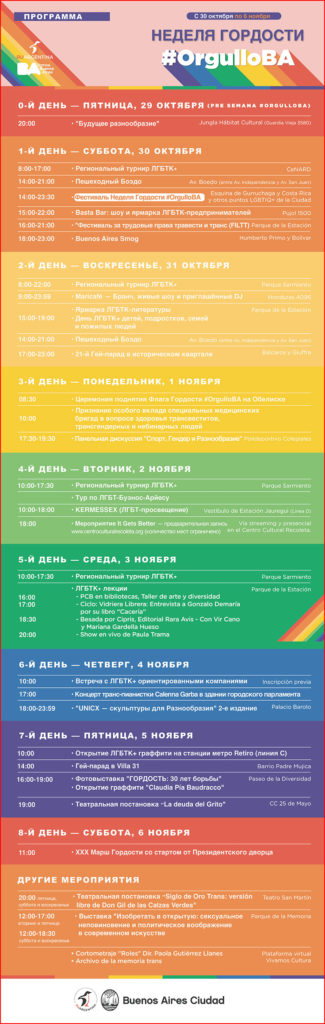 В субботу, 30 октября, в Буэнос-Айресе началась Неделя Гордости – семь дней по всей столице Аргентины будут проходить мероприятия, направленные “на укоренение и закрепление” идей равенства людей вне зависимости от пола и сексуальной ориентации. Кульминация недели гордости – большой ЛГБТК-прайд, который традиционно проходит по Майскому проспекту столицы Аргентины – передаёт “RuArgentina.Новости” со ссылкой на сайт мэрии Буэнос-Айреса.