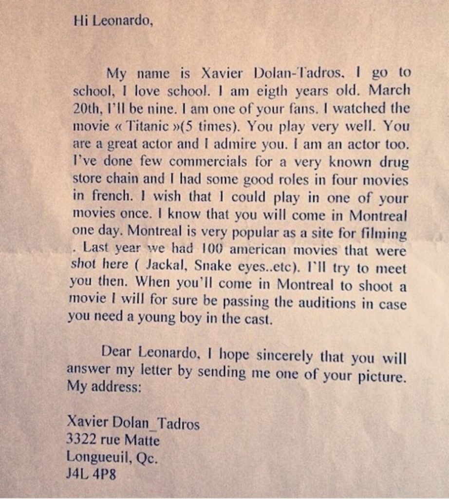 “Дорогой Леонардо, меня зовут Ксавье Долан-Тадрос, – приводит текст письма Kinopoisk. – Я хожу в школу, которую люблю. Мне восемь лет. 20 марта мне исполнится девять. Я твой поклонник. Я посмотрел фильм “Титаник” пять раз. Ты в нем очень хорошо играешь. Ты отличный актер, и я тобой восхищаюсь”.