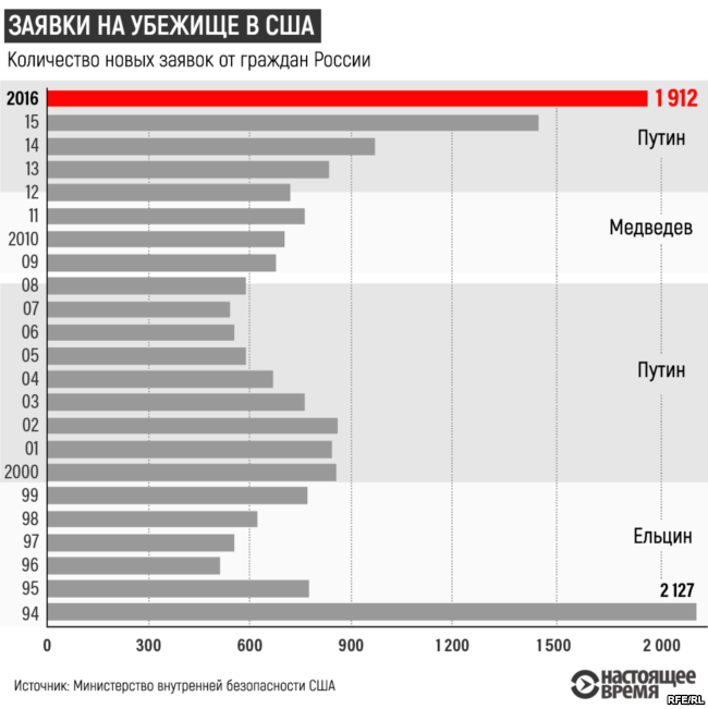 Число россиян, попросивших убежище в США, росло последние четыре года, а по итогам 2016 года достигло рекордных цифр за 20 лет (свежие данные за 2017 год пока еще не опубликованы).