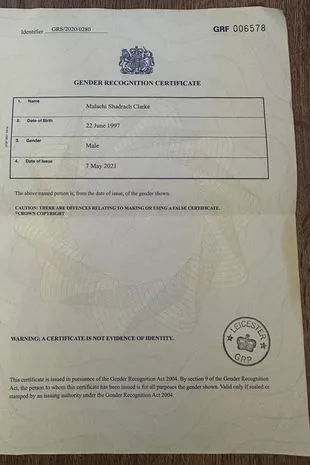 «Мама тоді була шокована», – каже він. Після цього він почав представлятися чоловіком, а згодом змінив своє ім’я на Малахія Шадрач Кларк. «Я обрав обидва біблійних імені «Малахія» і «Шадрах», тому що у мене ступінь з богослов’я, а прізвище змінив на «Кларк», тому що я люблю Райлана Кларка!», – хихикає він.