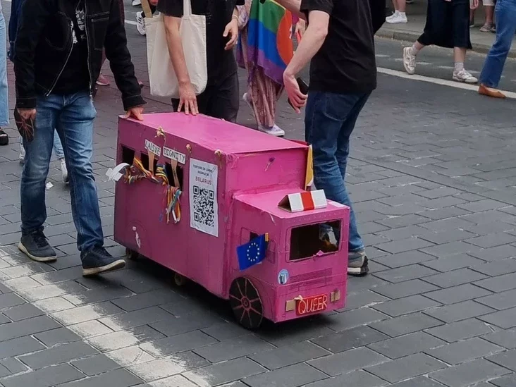 На чолі білоруської колони вже традиційно їхав іграшковий рожевий автозак — він став своєрідним білоруським “богартом”, якого можна перемогти лише перетворивши його жахливий образ на комічний. Слідом за автозаком йшли білоруські активісти, правозахисники, представники Об’єднаного перехідного кабінету Білорусі та просто небайдужі до проблем ЛГБТ люди.